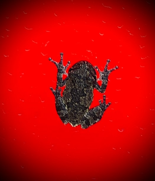 Image description – metallic looking tree frog sitting on a dirty reddish orange surface.