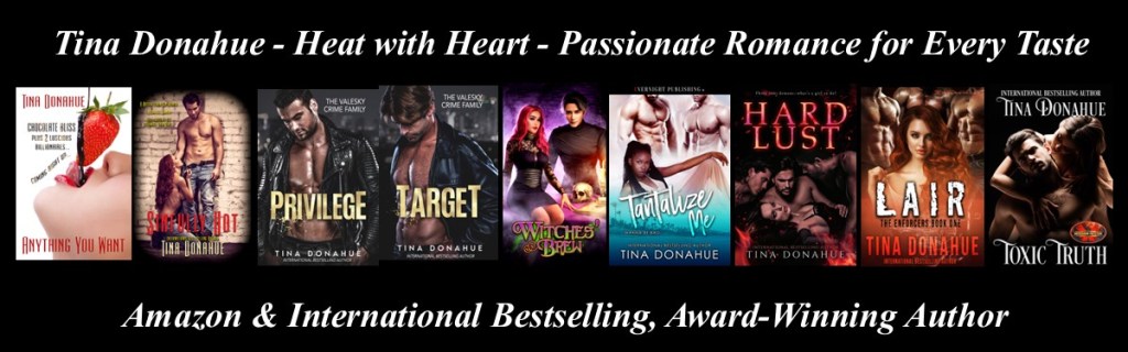 Tina’s an Amazon and international bestselling novelist who writes passionate romance for every taste – ‘heat with heart’ – for traditional publishers and indie. Booklist, Publisher’s Weekly, Romantic Times and numerous online sites have praised her work. She’s won Readers’ Choice Awards, was named a finalist in the EPIC competition, received a Book of the Year award, The Golden Nib Award, awards of merit in the RWA Holt Medallion competitions, and second place in the NEC RWA contests. She’s featured in the Novel & Short Story Writer’s Market. Before penning romances, she worked at a major Hollywood production company in Story Direction.