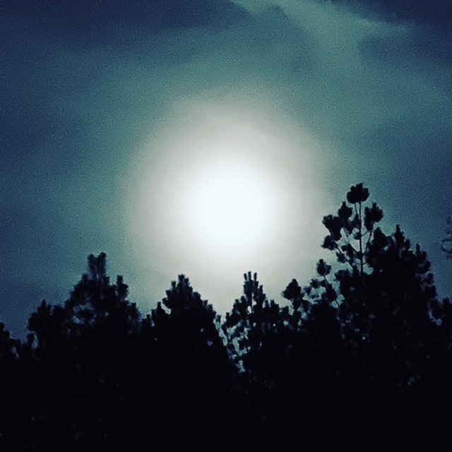Image description – a photograph of the night sky. The moon is visible and shining bright above several trees.