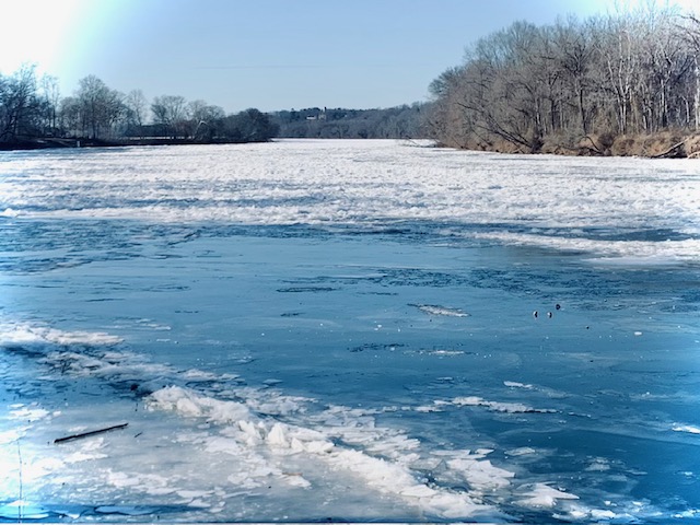 Image description – The sun is shining on a partially frozen section of the James River. Sections of ice are thick in outer areas and broken and thin towards the middle.