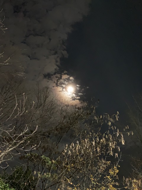 Image description – photograph is of the night sky. Clouds are on the left side, the moon is in the middle, and clear dark sky is on the right side of the photo. Barren branches rise from the bottom of the photo.