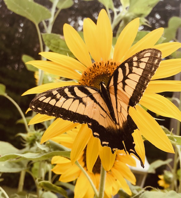 Image Description: a photograph of two large yellow sunflowers. A yellow and black butterfly sits on one of the sunflowers.