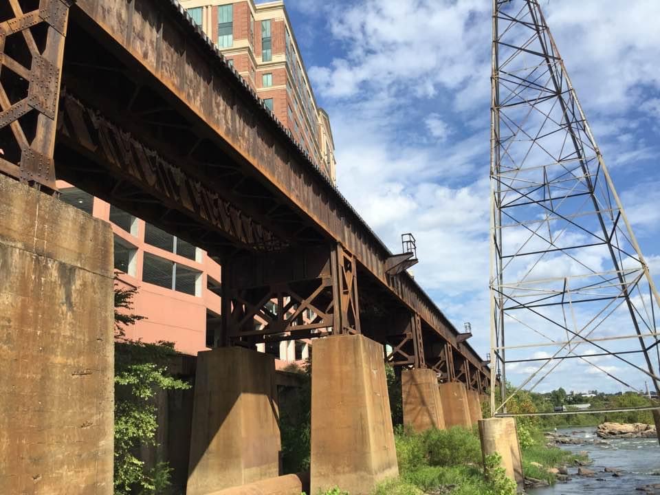 Image description – photo of the James River which is mostly obscured by a rusty transmission tower, the view underneath railroad tracks, and an expansive building. The blue afternoon sky is slightly hazy and grayish.